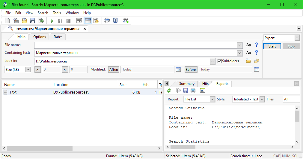 В нижней правой части отображаются данные для отчета; на вкладке Hits будут показаны совпадения внутри текста, если выполнялся внутритекстовый поиск. Запускается поиск кнопкой Start.