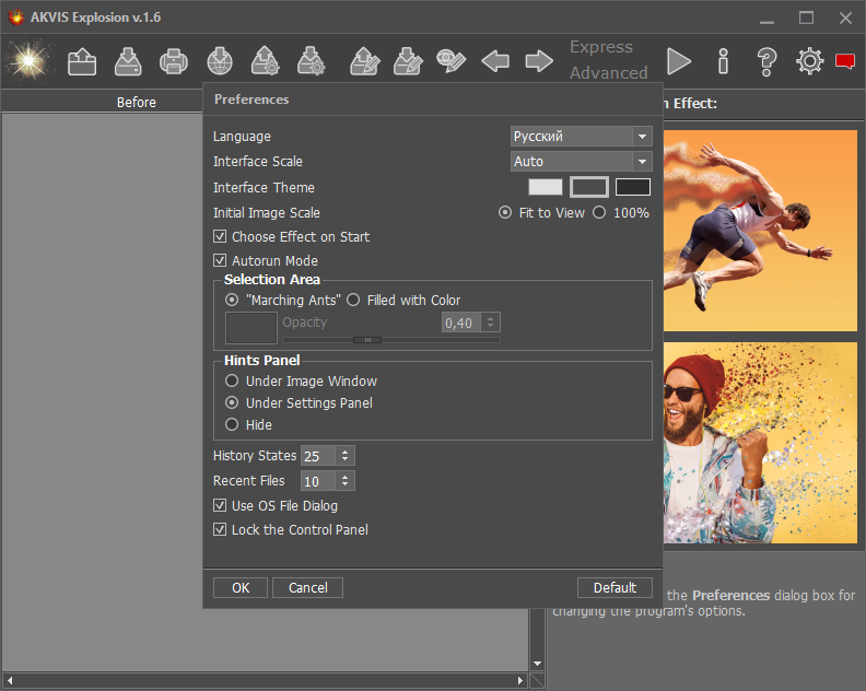 Как и все продукты разработчика, AKVIS Explosion является платной, но в течение 10 дней вы можете испытывать ее возможности, не платя ни копейки и безо всяких функциональных ограничений. Язык интерфейса по умолчанию — английский, но в настройках можно выбрать русский, что облегчит вам работу с параметрами настройки эффектов.