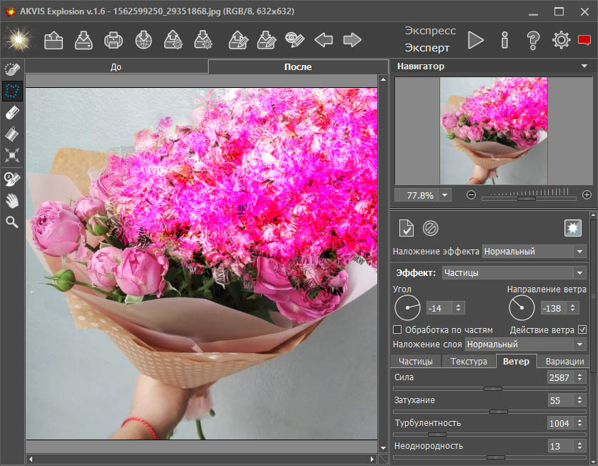 Вы можете выбрать тип наложение эффекта («Обычный» представляется нами наиболее реалистичным), направление и угол разлета частиц, дополнительно можно отключить или настроить такие эффекты как непрозрачность струй и дыма, отключить детализацию частиц. Естественно, единожды применённый эффект можно отменить или заменить его на «Частицы». Здесь вам уже будут доступны такие эффекты как размер (в программе эта опция называется «плотность»), дистанция и угол поворота частиц, тип их текстуры, направление «уносящего» их ветра и так далее.