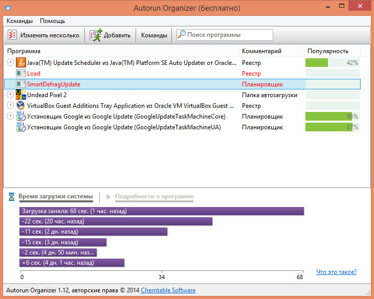 Утилита имеет простой, русифицированный интерфейс, удобна и безопасна для использования новичками. Элементы автозагрузки отображаются в виде списка с указанием типа записи и рейтинга популярности. В нижней части окна имеется диаграмма, показывающая статистические данные относительно времени загрузки системы. Наличествует простейший поиск компонентов загрузки по имени или его части.