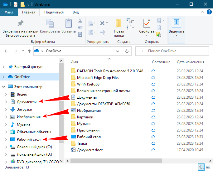 При включении облачной синхронизации в OneDrive создаются папки «Рабочий стол», «Документы» и «Изображение», после чего файлы из одноименных каталогов в профиле пользователя переносятся в облако, а в разделе реестра: