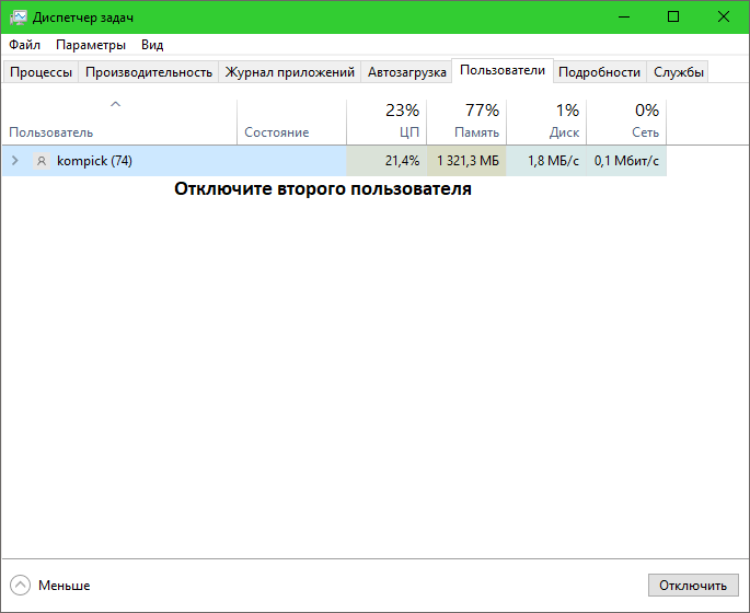Завершите все лишние сеансы вручную через вкладку «Пользователи» в «Диспетчере задач».