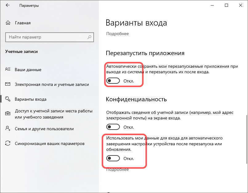 Зайдите в «Параметры» — «Учетные записи» — «Варианты входа» и отключите опцию «Использовать мои данные для входа, чтобы автоматически завершить настройку после обновления».