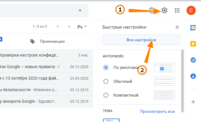 Перейдите в браузере в свою почту Gmail, кликните по расположенной в правом верхнем углу кнопке в виде шестеренки и нажмите «Все настройки».