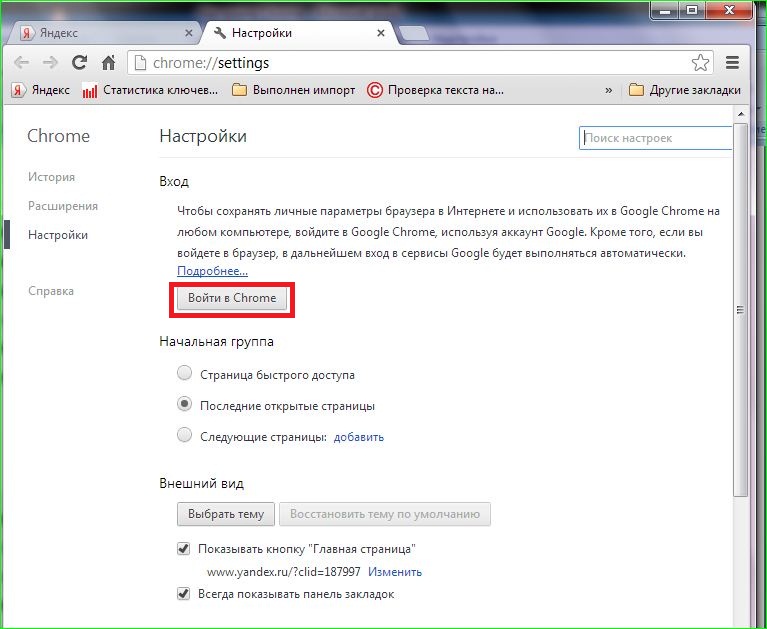 В самом верху меню настроек имеется активная кнопка входа на сервис Chrome.