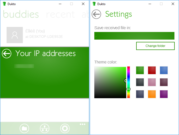 Функция обнаружения подключённых к локальной сети устройств в Dukto встроенная, если же последние по какой-то причине не смогут быть обнаружены, пользователь может задействовать ручное подключение по внутреннему IP-адресу. Дополнительные возможности программки включают выбор каталога для сохранения полученных файлов, смену цветовой темы оформления, просмотр истории передач. Настроек Dukto практически не содержит.