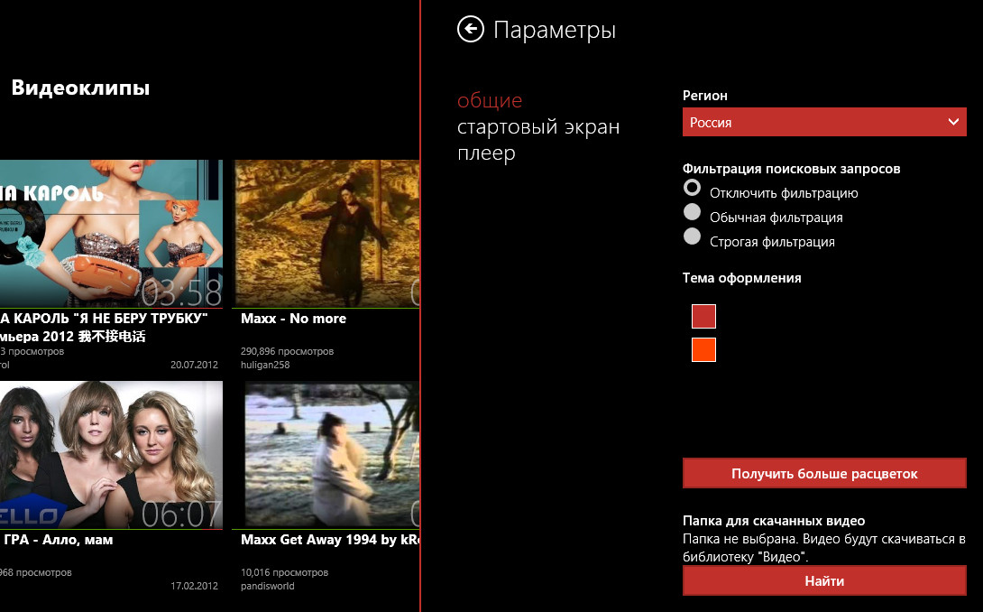 Metro-кнопка «Домой» и вовсе минимизирует окно воспроизведения видео, предоставив на обозрение весь функционал приложения. Таким образом можно, досматривая один видеоролик, искать следующий для просмотра.