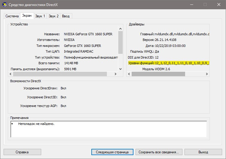 Определить наличие поддержки Level 12 нетрудно, для этого командой dxdiag запускаем «Средство диагностики DirectX», переходим на вкладку «Экран» и смотрим, какие уровни функций доступны в разделе «Драйверы». Отсутствие уровня функций 12 станет означать, что видеокарту придется заменить.
