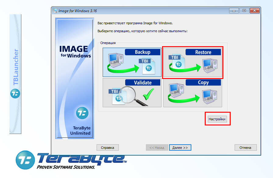 Бекап будет сохранён в указанном расположении в виде контейнера TBI. Теперь представим, что Windows оказалось повреждена и не может загрузиться. Загружаемся с ранее подготовленного диска, заходим в настройки и снимаем флажок с чекбокса «Простые операции». Тут же есть интересная опция «Использовать новую MBR». Если вы её задействуете, программа создаст новую загрузочную запись. Поскольку мы включали MBR в резервную копию, попробуем отключить опцию. Возвращаемся в главное окно, жмём «Restore» и выбираем режим восстановления.