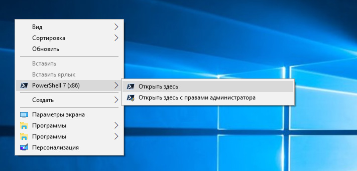 В результате в контекстном меню Проводника у вас появится пункт «PowerShell 7» с двумя подпунктами «Открыть здесь» и «Открыть здесь с правами администратора».