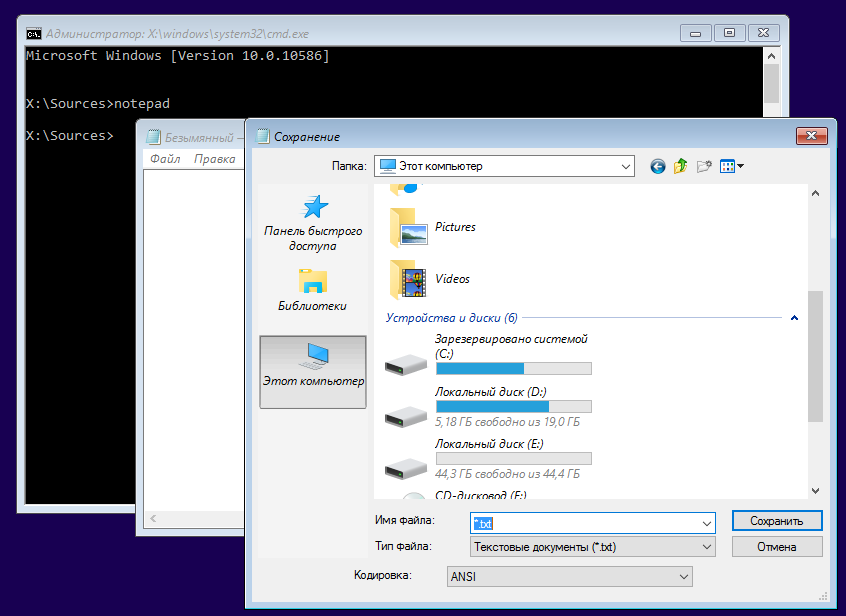 Если вы не уверены в правильности расположения системы, выполните в командной строке команду notepad и выберите в меню Файл -> Сохранить как. Нажмите в открывшемся окне сохранения «Этот компьютер» и посмотрите какую букву у вас имеет системный раздел.