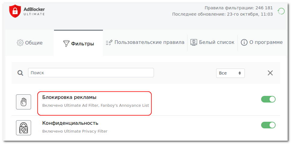 Например, в AdBlocker Ultimate для этого нужно зайти в раздел «Блокировка рекламы» и включить опцию «Fanboy’s Annoyance List».