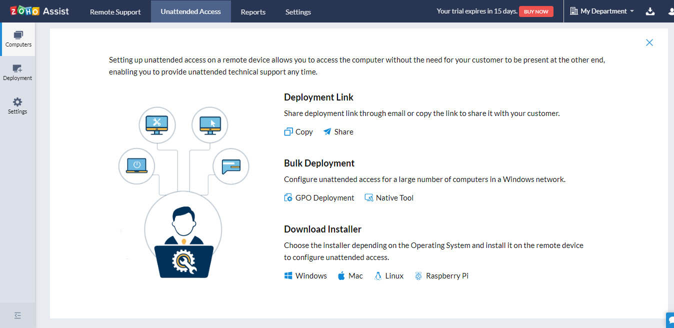 Подключиться к удаленному ПК в Zoho Assist можно двумя способами — через веб-интерфейс и через приложение-клиент, доступный для скачивания в разделе «Unattended Access».