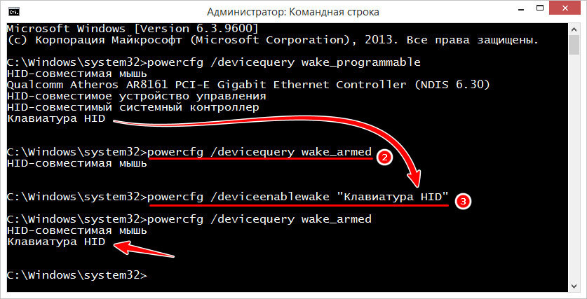Предоставим ей такое разрешение, для чего выполняем в командной строке команду powercfg /deviceenablewake "Клавиатура HID", а затем проверяем разрешения предыдущей командой.