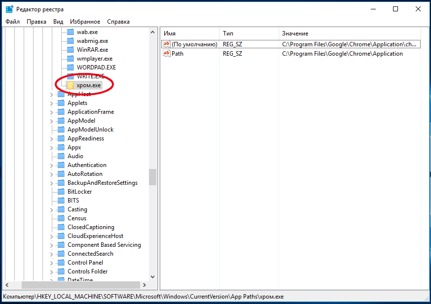 Все ключи содержат по два параметра: один по умолчанию, другой с именем Path. В качестве значения первого параметра указывается полный путь к исполняемому файлу приложения, а в качестве второго — путь к содержащей его папке в файловой системе Windows.