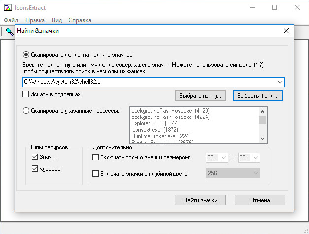 Если хотите поработать с другими файлами, пожалуйста, через стандартный обзор в IconsExtract можно указать любой файл формата EXE, DLL, CPL и OCX или даже папку, содержащую несколько таких файлов.