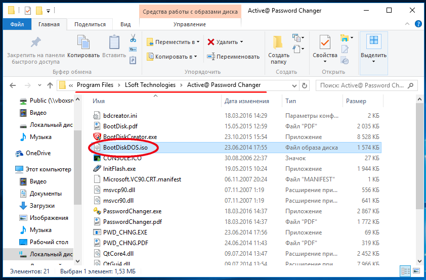 Только позаботиться об извлечении образа и записи его на флешку следует заранее, ведь «вытащить» его можно только из установленной или раскомпилированной программы. Итак, после того как вы скачаете и установите демоверсию Active Password Changer (сама программа платная), зайдите в её папку в Program Files и скопируйте из неё файл BootDiskDOS.ISO. Этот образ необходимо записать на флешку, сделав её загрузочной, для чего можем порекомендовать использование утилиты WinSetupFromUSB.