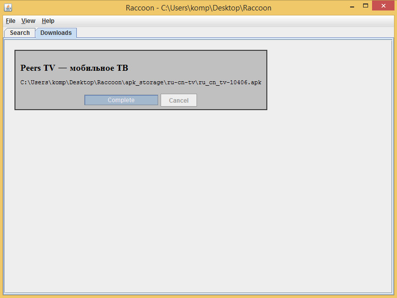 Для примера давайте скачаем какое-нибудь приложение. Пусть это будет Peers TV. Вбиваем название в поисковую строку и нажимаем на стрелку вверх-вниз в конце строки, после чего программа выведет список приложений с найденными совпадениями в имени. Теперь жмём «Download» и сохраняем файл на компьютер. Скачиваются файлы в папку Raccoon, предварительно созданную утилитой на рабочем столе. Как видите, всё очень просто. Жаль вот только, что нельзя загружать платные приложения. Также вряд ли у вас получится найти и скачать приложение, недоступное для региона вашей учетной записи.