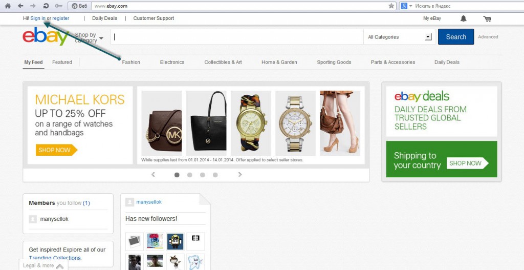 После этого на ваш электронный адрес придет письмо, подтверждающее вашу регистрацию. После стоит снова перейти на сайт Ebay и авторизоваться, нажав на кнопочку «Sign in»: