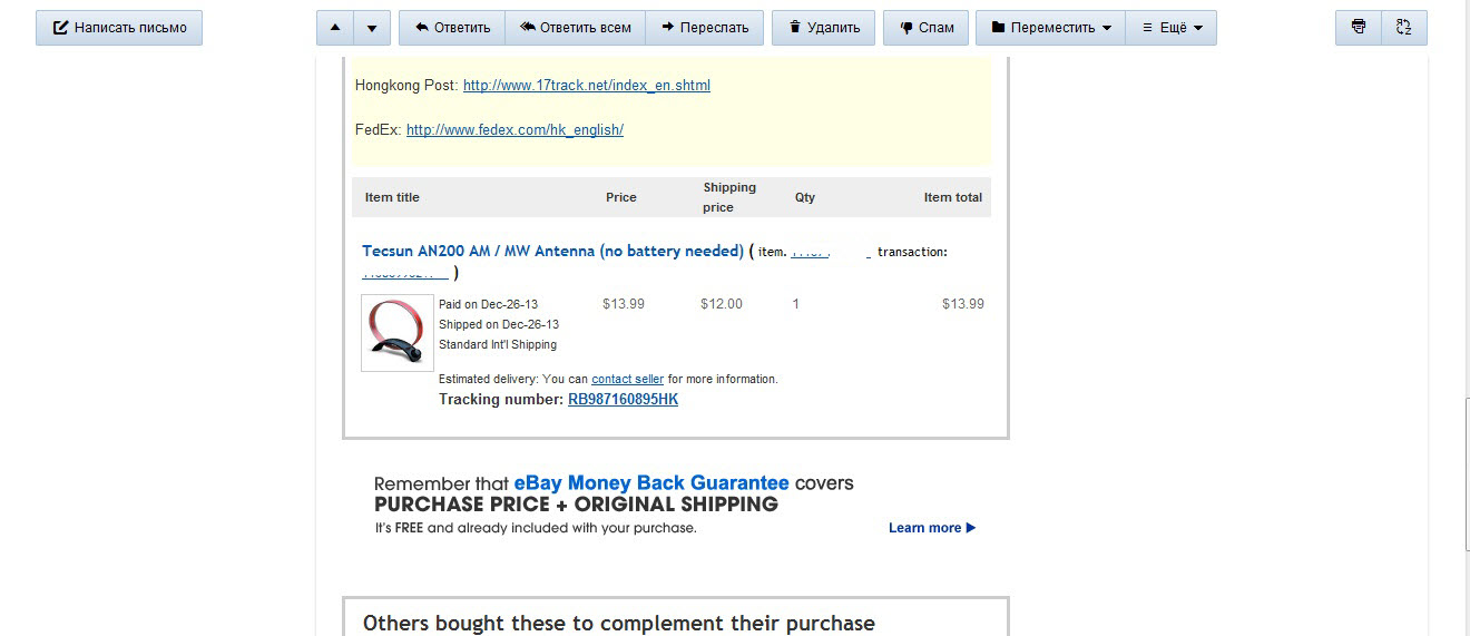 Кроме этого, детали сделки также можно посмотреть и в письме, которое вы получите на свой адрес электронной почты. Спустя пару дней на свой e-mail вы также получите письмо, свидетельствующее о том, что продавец отправил вам купленный товар.