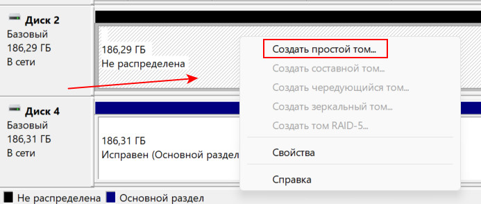 Далее работаем со свободным пространством RAID-массива – жмём на нём контекстное меню и создаём на нём один или несколько томов (разделов) диска.