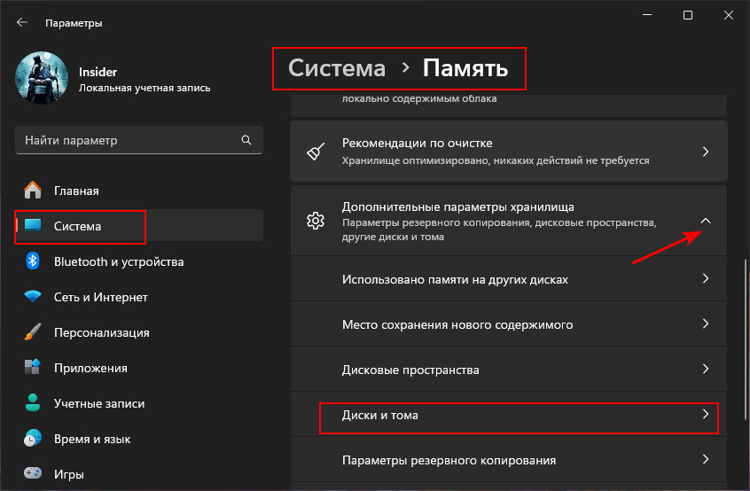 Для создания диска разработки в Windows 11 с установленным обновлением Moment 4 в системных параметрах открываем функционал по работе с дисками и томами.