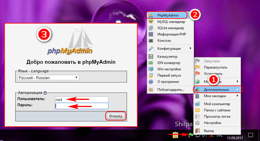 Следующий этап – создание базы данных MySQL сайта. В меню OpenServer кликаем «Дополнительно», выбираем «PhpMyAdmin». В окне браузера по умолчанию откроется интерфейс веб-приложения. В форме авторизации необходимо ввести лишь имя пользователя: