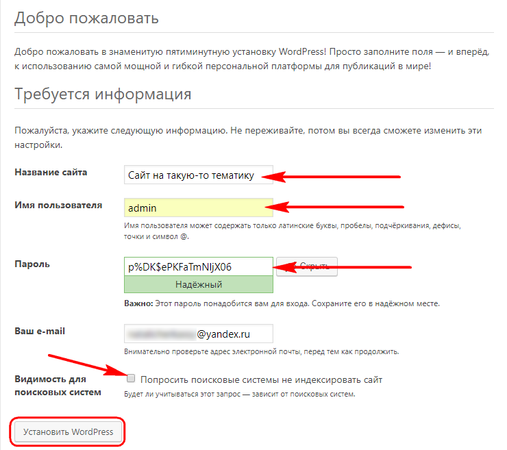 Он откроется в окне браузера по умолчанию на этапе первичной настройки сайта. Здесь указываем его название, придумываем имя пользователя и пароль админ-панели WordPress. Отмечаем галочкой отказ от индексирования сайта поисковиками. Жмём «Установить WordPress».