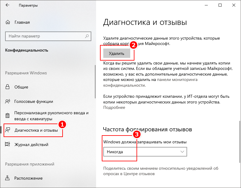 Откройте приложение «Параметры», перейдите в раздел «Конфиденциальность» → «Диагностика и отзывы» и нажмите кнопку «Удалить» в блоке «Удалить диагностические данные».