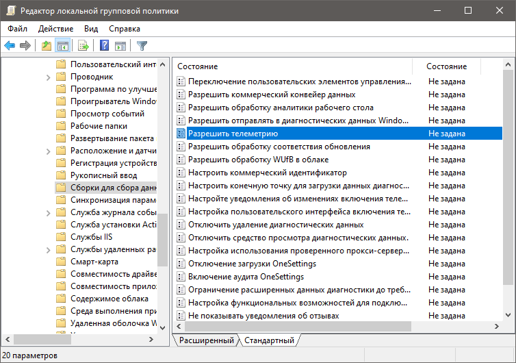 Откройте редактор локальных групповых политик командой gpedit.msc и перейдите в раздел «Конфигурация компьютера» → «Административные шаблоны» → «Компоненты Windows» → «Сбор данных и предварительные сборки».