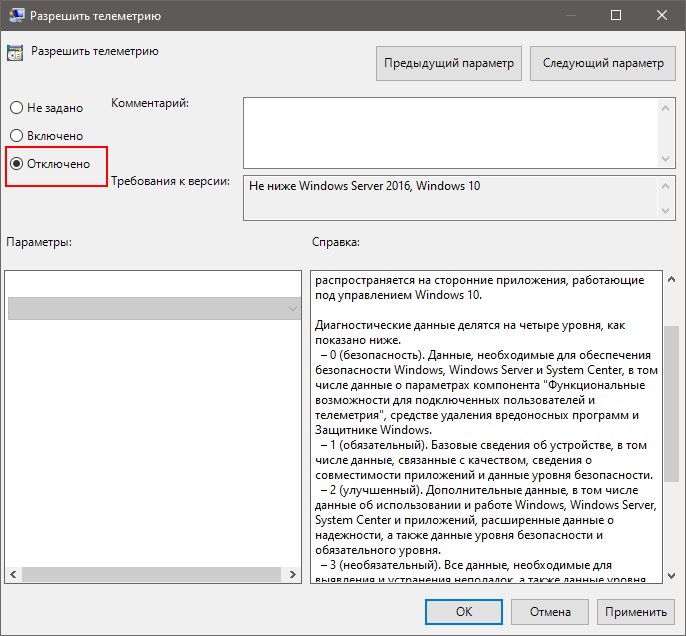 Найдите справа политику «Разрешить телеметрию», откройте её настройки и активируйте радиокнопку «Отключено».