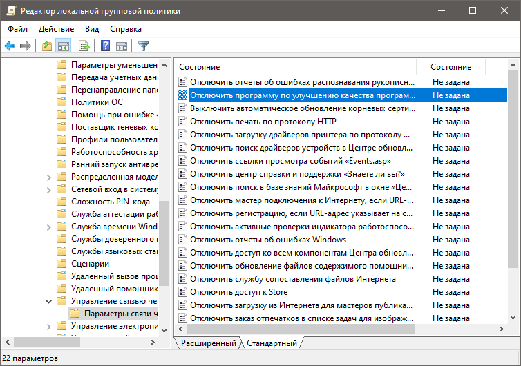 Затем в том же редакторе групповых политик перейдите в раздел «Конфигурация компьютера» → «Административные шаблоны» → «Система» → «Управление связью через Интернет» → «Параметры связи через Интернет».