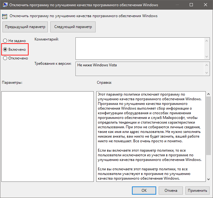 Включите политику «Отключить программу по улучшению качества программного обеспечения Windows».