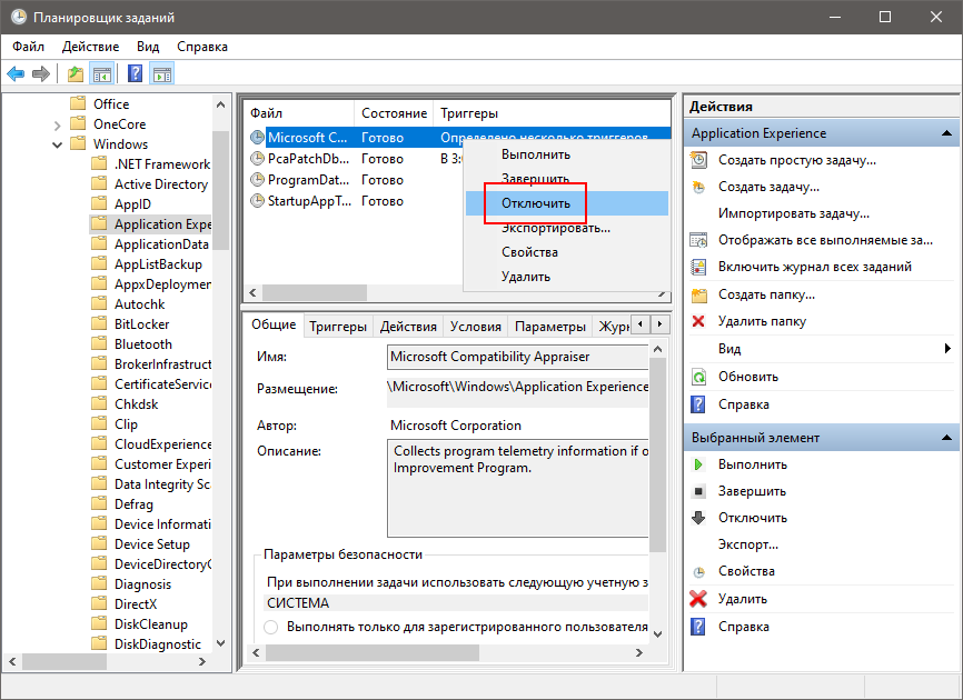 Также мы рекомендуем отключить задачи Microsoft Compatibility Appraiser и ProgramDataUpdater в Планировщике заданий (taskschd.msc).