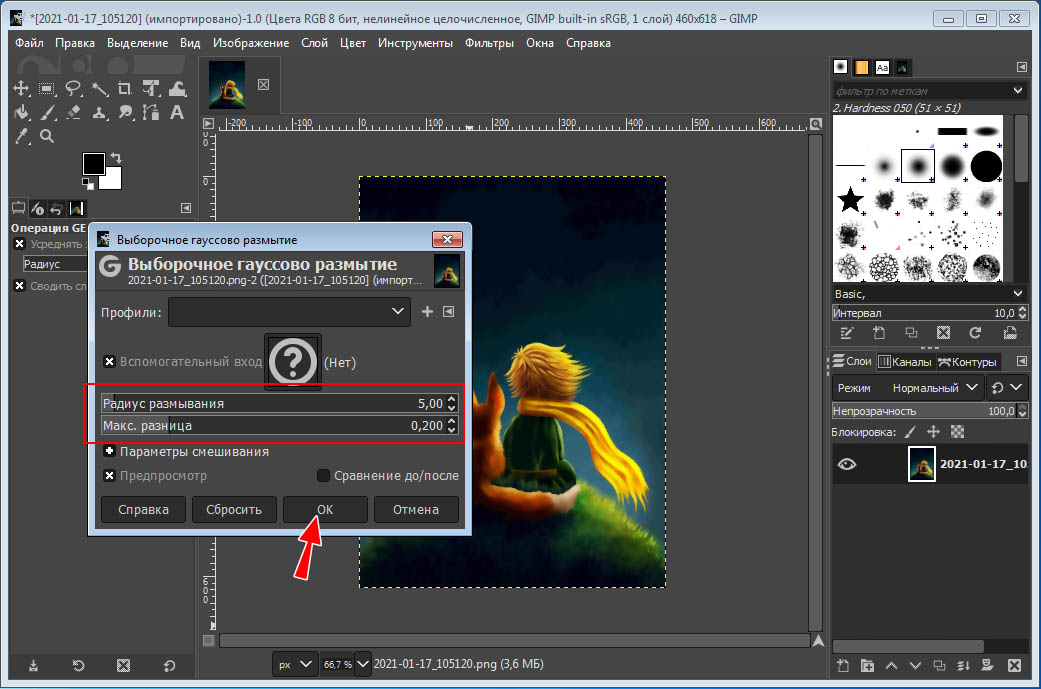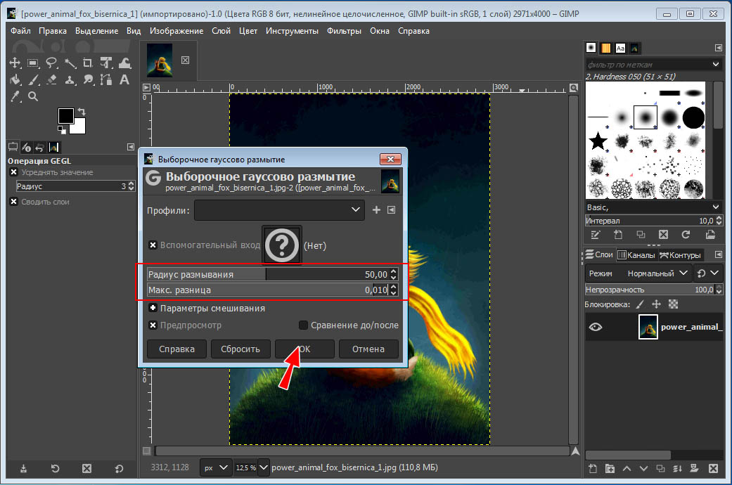Откройте изображение JPEG в редакторе и выберите в меню Фильтры -> Размытие -> Выборочное гауссово размытие.