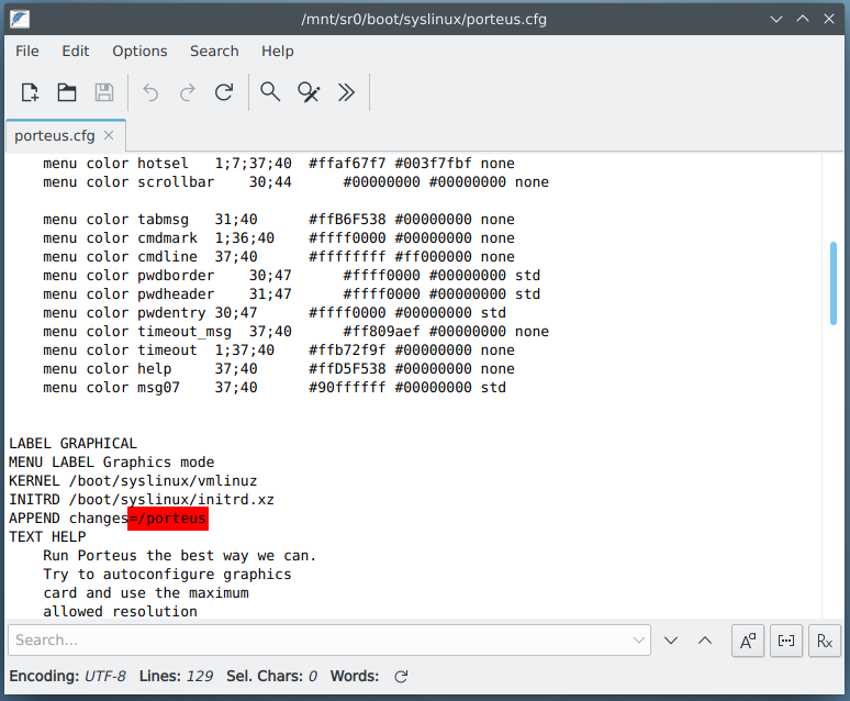 Отыщите в файле строку APPEND changes=/porteus и замените всё, что идет после знака равно на путь, по которому был сохранен созданный в предыдущем шаге файл контейнера.