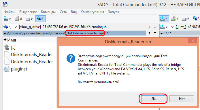 Любители популярного Total Commander могут извлекать данные Linux или Android внутри Windows с помощью этого файлового менеджера. Но предварительно установив в него специальный плагин. Один из таких плагинов - DiskInternals Reader, он умеет подключать и читать устройства информации, форматированные в Ext2/3/4, Fat/exFAT, HFS/HFS+, ReiserFS. Загружаем плагин, распаковываем его архив внутри Total Commander, подтверждаем установку.