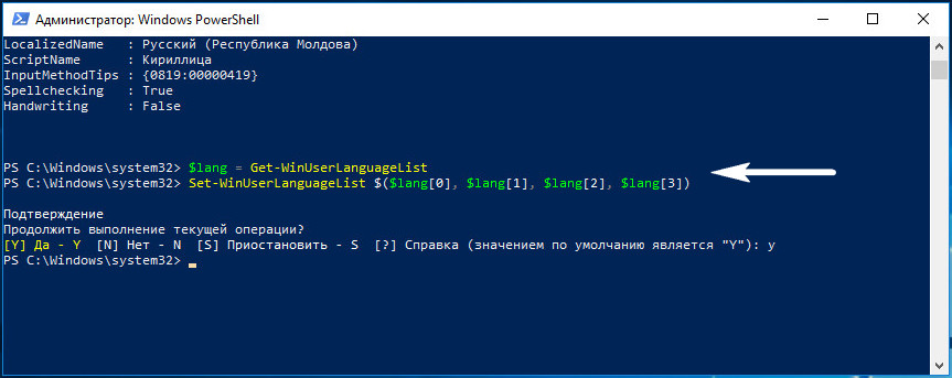 Языки ru-UA и ru-MD у нас лишние. Избавимся от них с помощью PowerShell. Первая команда помещает в переменную $lang все имеющиеся языки, вторая устанавливает только первых четыре, а пятый и шестой, соответствующее ru-UA и ru-MD при этом обрезаются. Подтверждаем действие и проверяем результат командой Get-WinUserLanguageList.
