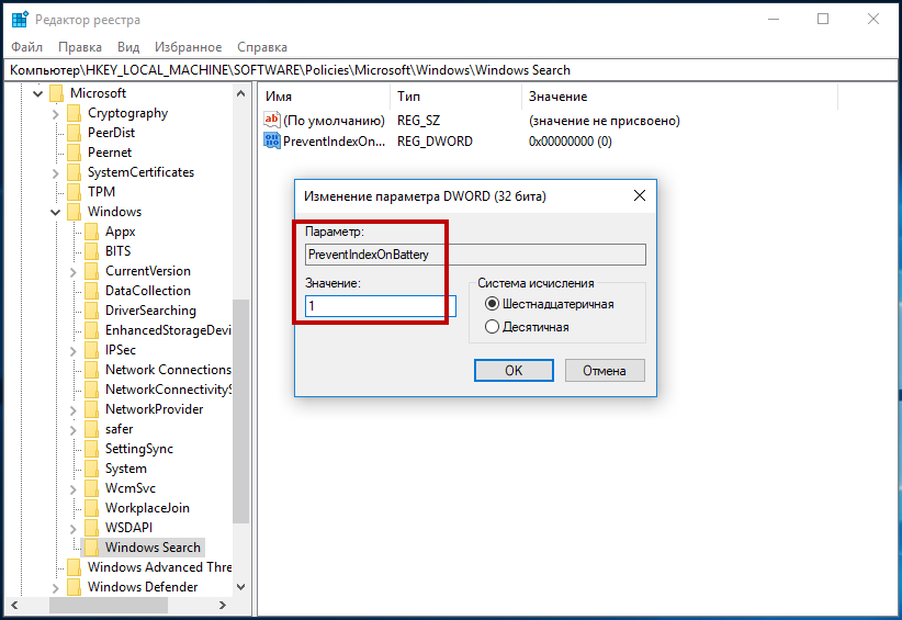 Назовите его PreventIndexOnBattery и установите в качестве его значения 1.