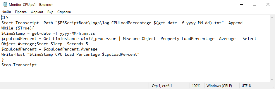 Создавать службу (чисто для примера) мы будем из процесса скрипта PowerShell, замеряющего среднее значения загруженности процессора и сохраняющего данные в текстовый лог.