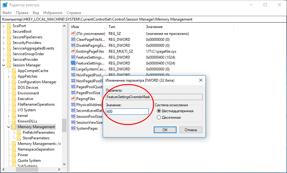 Создайте в правой колонке параметр типа DWORD (32-битный), назовите его FeatureSettingsOverride и выставьте в качестве его значение 400 в шестнадцатеричной системе счисления.