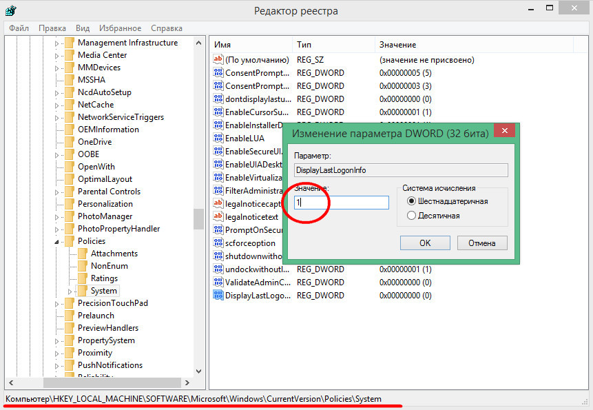 В последнем подразделе отыщите DWORD-параметр DisplayLastLogonInfo и в качестве его значения установите 1.