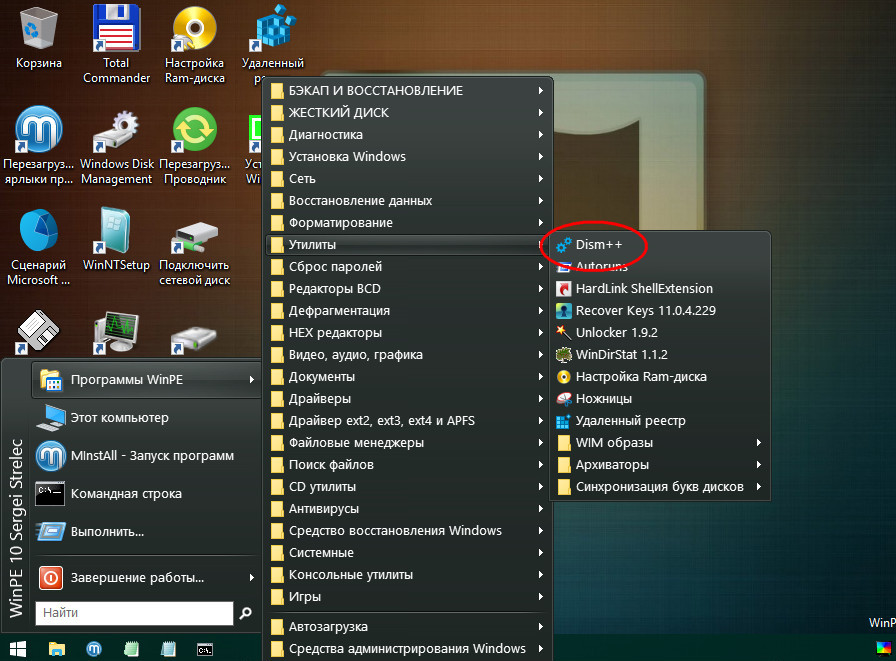Итак, загружаем компьютер с нерабочей Windows с диска Стрельца, идем в меню Пуск и выбираем там Программы WinPE -> Утилиты -> Dism++.