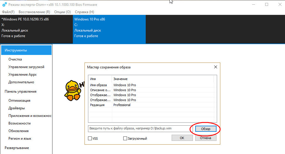 Укажите в качестве места сохранения WIM-образа любой раздел кроме системного.
