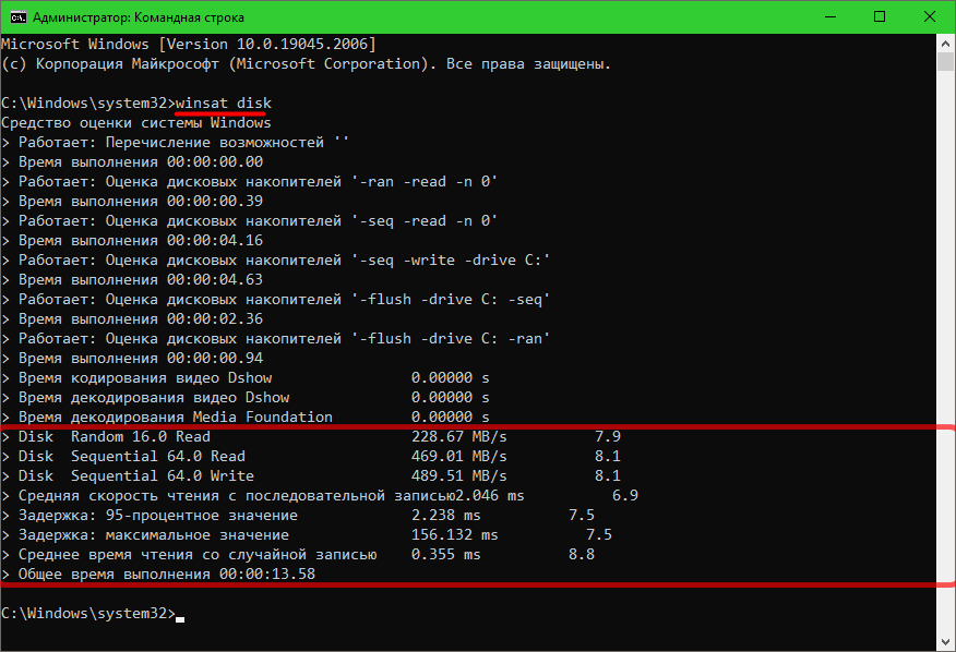 Для оценки производительности жесткого диска можно использовать команду winsat disk — выполните ее в запущенной от имени администратора командной строке или PowerShell.