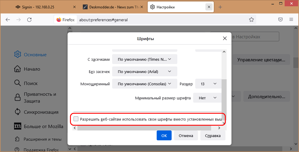 В открывшемся окошке снимите флажок с чекбокса «Разрешить веб-сайтам использовать свои шрифты вместо установленных выше».