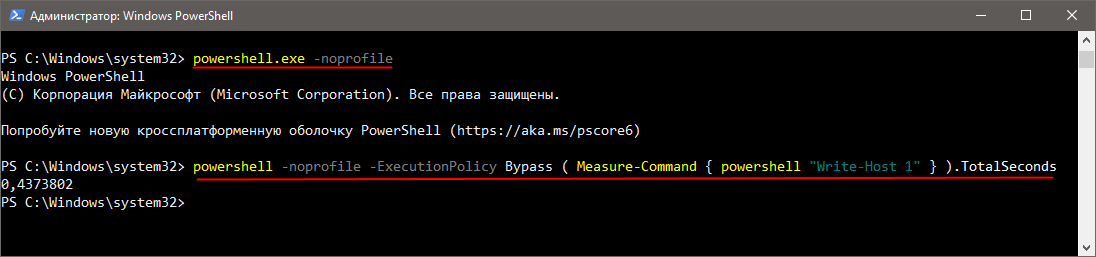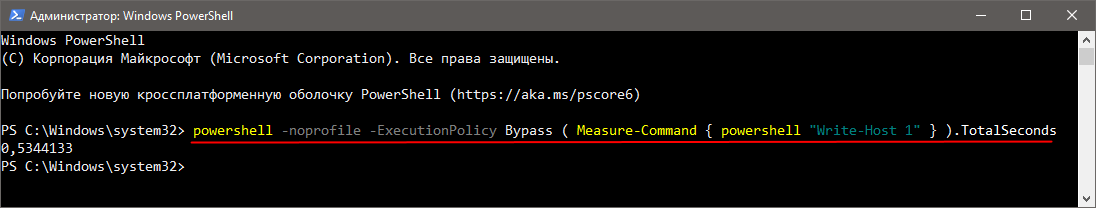 powershell -noprofile -ExecutionPolicy Bypass ( Measure-Command { powershell "Write-Host 1" } ).TotalSeconds