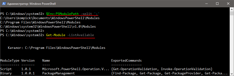 - $Env:PSModulePath -split ';' — выводит список каталогов, из которых загружаются модули.