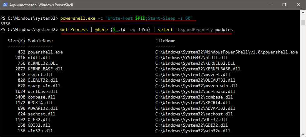 - Get-Process | where {$_.Id -eq <ваш_идентификатор>} | select -ExpandProperty modules — выводит список модулей и библиотек, используемых консолью.