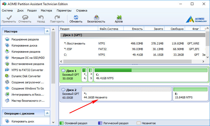 Первым делом необходимо подготовить диск назначения. Он, естественно, должен быть аппаратно подключён к компьютеру. И иметь тот же стиль разделов, что и у исходного жёсткого диска, на котором стоит Windows. Если исходный – диск GPT, то таким же должен быть и диск назначения. Если первый - MBR-диск, то и второй должен быть MBR-диском.